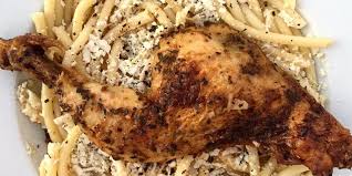 Kızarmış tavuk butu, fırın makarna, hellim peyniri ve nane ile servis edilir Fried chicken leg bucatini pasta Halloumi cheese and with dried mint