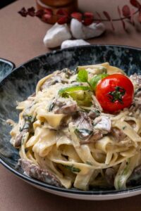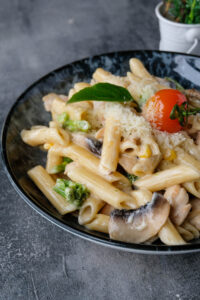 Tavuk bonfile, brokoli, mantar, mısır, penne makarna, krema ve parmesen peynir ile servis ...